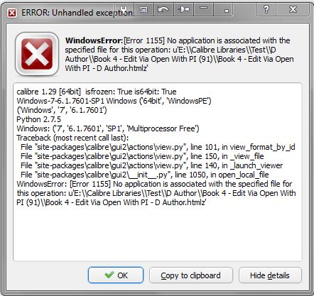 As far as I know the file type HTMLZ is peculiar to calibre see ==>> http://www.fileinfo.com/extension/htmlz The default handler within calibre itself for HTMLZ is the calibre ebook-viewer i.e. Preferences->Behaviour->Use internal viewer->HTMLZ is checked. Can you confirm that you have unchecked that setting ? Assuming you've done that, then when you click on the HTMLZ link in the Book Details panel calibre will ask Windows to open the file with whatever it has in its File Association table for HTMLZ. By default Windows wont have anything for HTMLZ so it will report an error to calibre, and calibre will display an error - see first attachment. So when you say Quote: