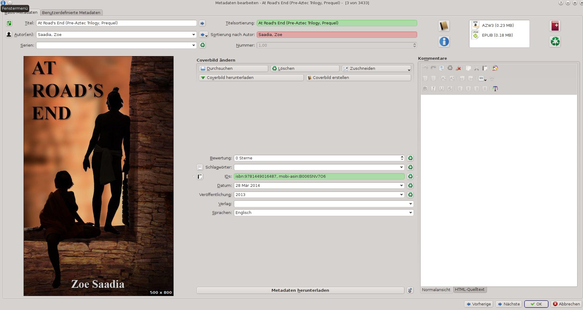 1. Import a Amazon-Ebook 2. Convert it to EPUB After Importing a book, Calibre seams to add IDs of books which are already in my library to new added book. ![]() For Example: "At Road's End (Pre-Aztec Trilogy, Prequel)" See attachment. IDs: isbn:9781449016487, mobi-asin:B006SNV7O6 The MOBI-ASIN is correct, but the ISBN links to "The Secrets of Hearty Turkish Home Cooking (Volume 1)" by Murat Yegul. This book is also in my library. I cant believe that that amazon or the author put a wrong ISBN to the metadata. Also the wrong IDs are always refering to books I did add at the same time to Calibre. When adding multiple Ebooks, Calibre seams to confuse the IDs of the books... |