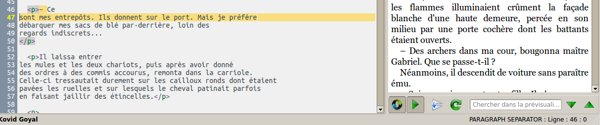 <span face="Georgia">(.*?)</span> \1 To get rid of them, I just added a new regex which destroyed all of them, including the ones left in the text files, and then launched "Beautify all files" (Embellit tous les fichiers) which reinstates them only in the right places. (screenshot2 - normal code display) Maybe when performing a regex suppressing tags in the text files, it would be nice if the Calibre editor could check if there are still some unwanted separators left? Last edited by roger64; 04-26-2014 at 03:48 AM. |