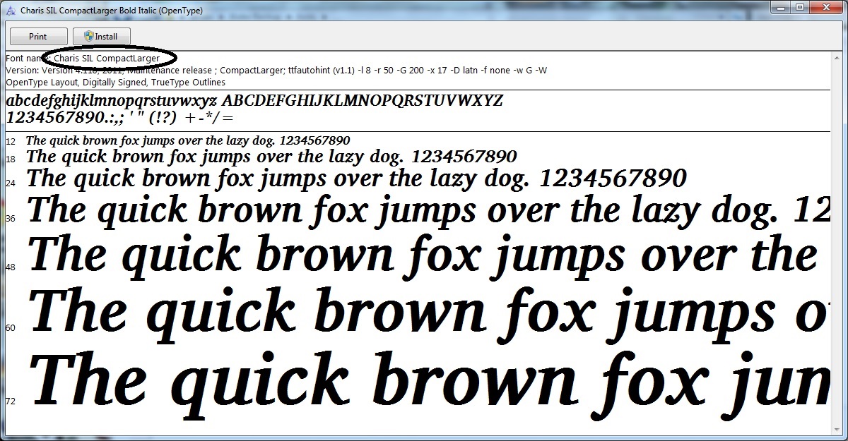 In a spoiler in the first message of Modified Fonts thread, you'll find a quote from a Kobo developer, George Talusan: "but Qt doesn't allow us to introspect a TTF/OTF for its font family/weight without difficulty." which requires us to use the font family name with -font style/weight. When I looked at the hinted version of Charis SIL that JSWolf mentioned in a previous message in this thread, I had to rename the files in the archive to get them to work happily on my Kobo -- the CharisSILCompactLarger files needed to be changed to Charis SIL CompactLarger (with the embedded spaces) and the CharisSILSmCPCompactLarger files needed to be changed to Charis SIL SmCP CompactLarger (again embedded spaces). The other item to remember is that after installing a new font, you MUST power cycle your Kobo ereader before attempting to use the font. My personal choice of font that I use the vast majority of the time is JSWolf's modified Charis SIL package. My alternative for books with a lot of Greek/Cyrillic is Deja Vu Serif. Edit: added screen cap of font viewer showing the font family name. Regards, David Last edited by DNSB; 07-06-2014 at 01:58 AM. Reason: added image |