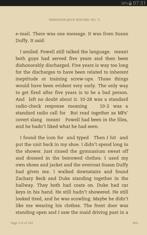 Then I started Lee Child's Persuader (Jack Reacher #7) on the same Kindle app. Lo and behold, again there were chunks missing. He was given a small e-mail device and all those e-mail exchanges are so far missing on Android. Well, this is a BPH book that I paid $7.99 for (outside US pricing) and my expectations are obviously higher. Hence I opened it in my Kindle Keyboard tp see if the text was missing there as well. Nope it wasn't (which forces me to reconsider the earlier book). Everything was there. So, now I'm curious to know if anyone else has had issues with their Kindle for Android app. |