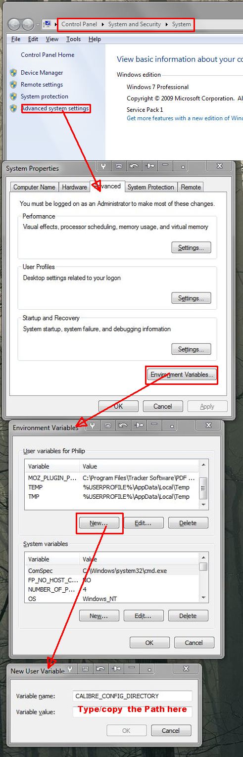I see " CALIBRE_CONFIG_DIRECTORY - sets the directory where configuration files are stored/read. " from the first link, but I can't figure out how to modify that. There's no way that I can find within Calibre to change it if it's even possible. The second link is, as you say, general. Now I realize that upon a second look at the way the manual includes and words it (" See How to set environment variables in windows " ) . I thought it would list something for Calibre, but it doesn't. Last edited by jecilop; 08-31-2014 at 04:08 AM. Reason: typos |