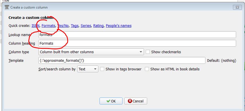 I went to [Add Your Own Columns] and used a [Quick Create] of Formats, and just accepted the suggested name, also 'Formats'. It might be a useful check to not allow someone to create a column with the same name as a 'keyword' Thanks again - I've renamed the 'Formats' column I created and everything is good now |