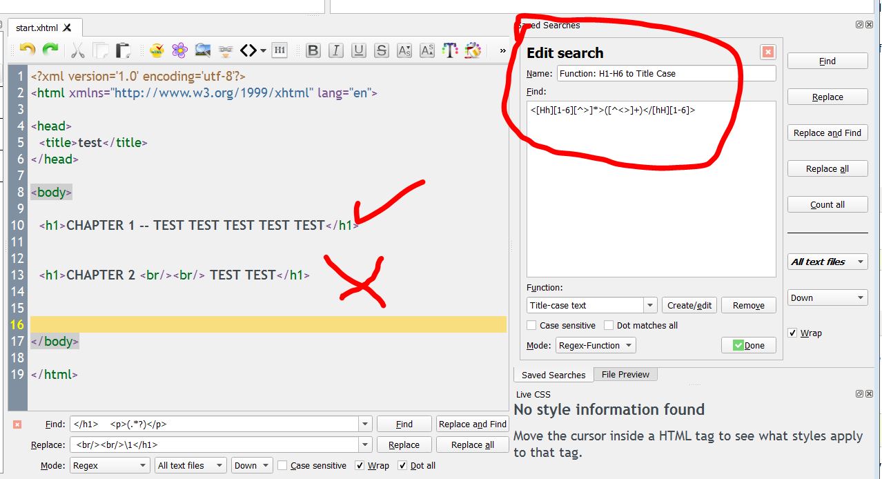 \<([Hh][1-6])\>.*?\</\1\> It would seem to me that if the built in Title Case would ignore tags and what's in them, and just act on the 'Find' it should / would work for any embedded tags inside Hx pairs not just <br/> Am I misunderstanding?