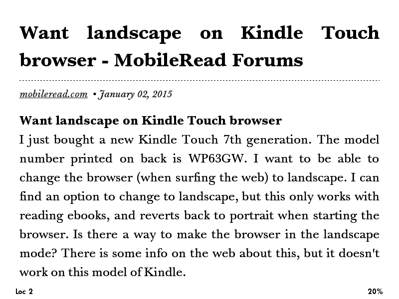 I just bought a new Kindle Touch 7th generation. The model number printed on back is WP63GW. I want to be able to change the browser (when surfing the web) to landscape. I can find an option to change to landscape, but this only works with reading ebooks, and reverts back to portrait when starting the browser. Is there a way to make the browser in the landscape mode? There is some info on the web about this, but it doesn't work on this model of Kindle.