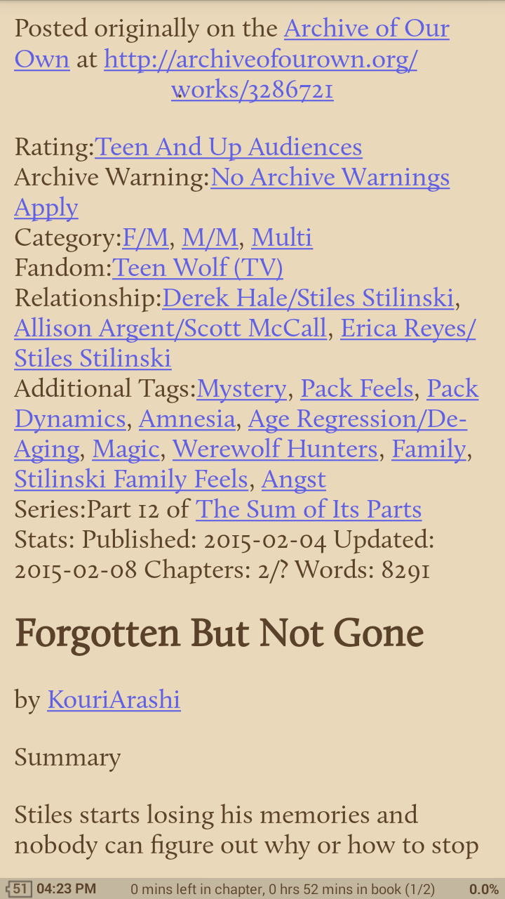 However, the last couple of days, whenever I try it, I get either a blank page, or a bunch of symbols. I don't think it's an AO3 issue, because the same files open fine with Mantano and Aldiko, I just prefer Moon+. Does anyone have any idea what's causing this, or have a place where I can email Moon+'s tech support directly? |