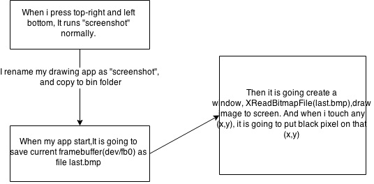 I think "pressing left-bottom and right-top" captures screen. How can i listen specific gesture events. We should create a app that will work in background. If it is hard, I will change name of that drawing app as fbgrab and copy to bin folder. when i press "left-bottom and right-top" anytime, my drawing app will work. But i will not be able to screenshot anymore.