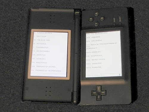 The Moon Books Project is a website dedicated to bringing classic literature, comics, and films freely and legally to users of the nintendo ds game console. That website even has some screenshoots using the Nintendo DS in landscape and portrait orientations. See the first two attached images below. You don't even need to "hack" your unit; just get a R4 (Revolution for DS) cartridge and a MicroSD card and your set! I like the ReadMore homebrew software, with an 8pt font, and holding the screen in portrait mode (i.e. taller vertically). The Nintendo DS Lite is best suited/more comfortable for portrait mode and even feels like you are holding a book. It won't replace my ebook reader, but is a nice alternative. But the best software is DSOrganize (homebrew) which has a nice built-in text reader (landscape only) as well as a web browser capable of surfing the MobileRead.com website (it even displays avatars and smilies and allows you to download to the MicroSD card! Wow!). Again, won't replace my laptop for mobility, but a nice substitute! I haven't spent too much time with this (as my kids are attached to their Nintendo DS!), but can see this maturing into a niche area for Nintendo...