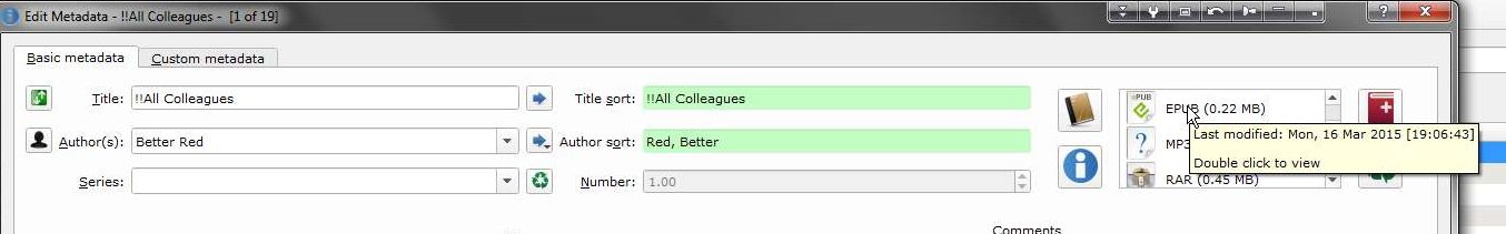 But for your purpose, comparing dates, it's probably easier to use your file manager - select the book (i.e. highlight in book list) press 'o' and sort file manager window (explorer, finder, nautilus... whatever) on Date Modified. But as theducks said things like Polish, Embed, Modify plugin etc will change the metadata in some file types but not the content - which is I assume is what interests you. Generally speaking any change, to any file, by any program, will change the Date Modified. How I manage originals: After using the downloaded file to create the book in calibre, I rename it to *.*.orig and add that file to the book. Then at least I can find it. Periodically (random intervals) I'll cull .orig files from older books that don't have '_keeporig' in #admintags. If I want to retain a record of the original file name, source location (most of my books are not commercial publications) etc, I put the data into the #booknotes column (comments like). BR |
