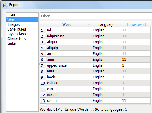 Use "Edit Book" -> Tools -> Reports to get some basic idea about the used words in your document.