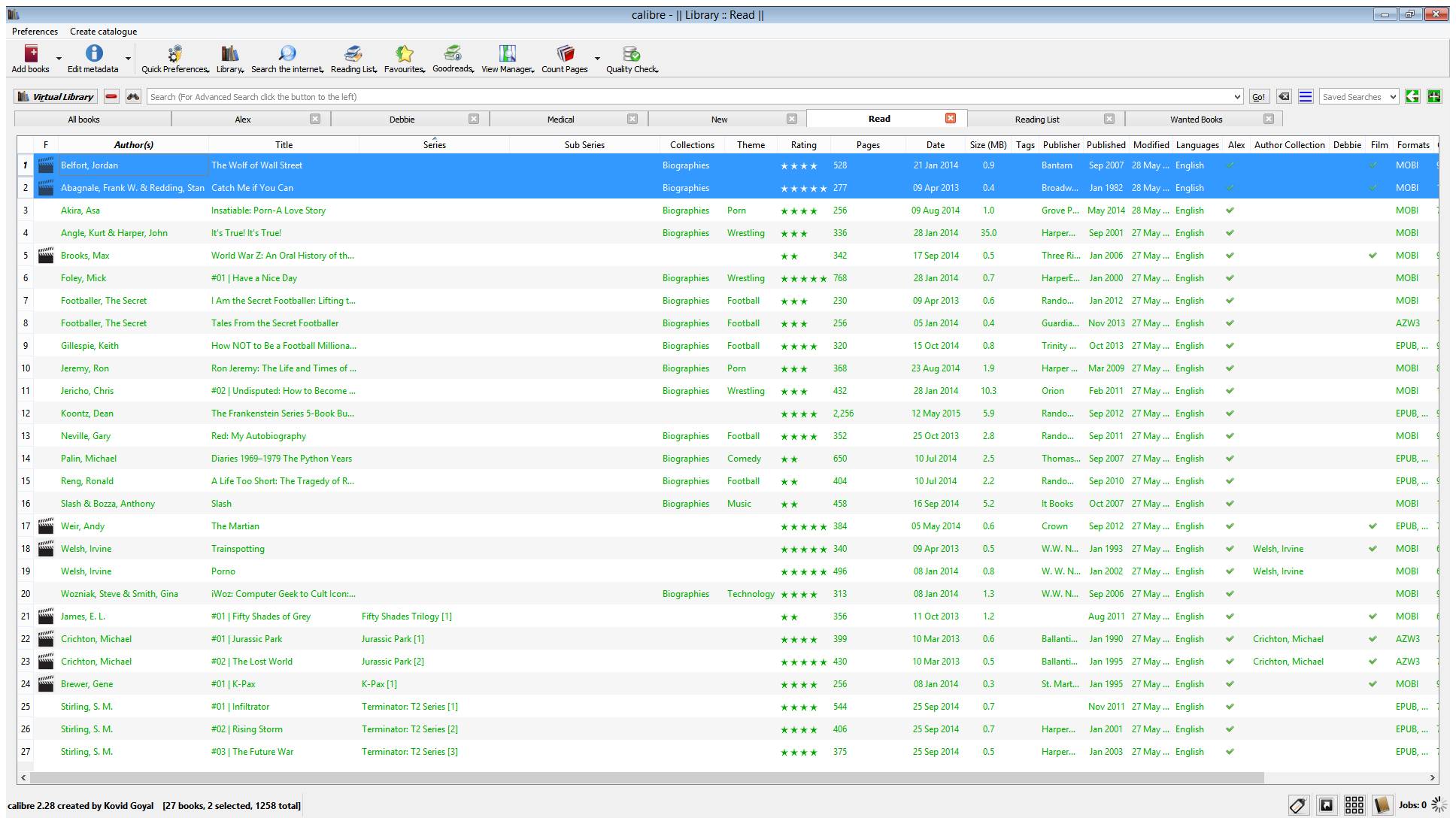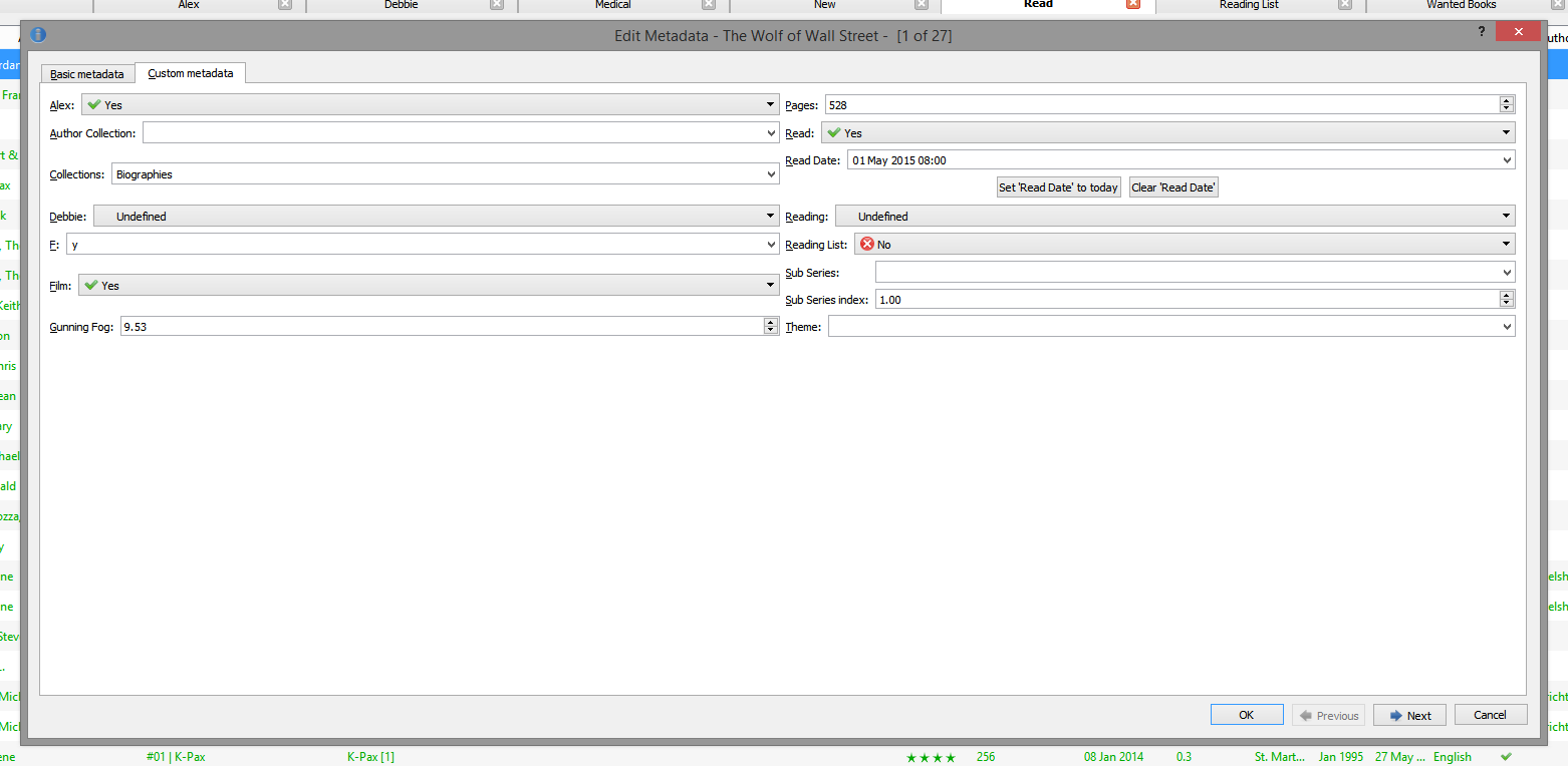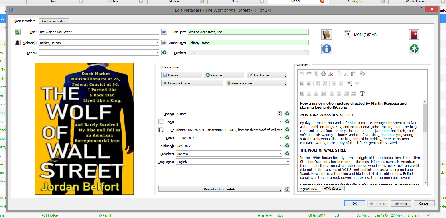 If I sort by the author(s) column then The Wolf of Wall Street is ordered correctly. If I then sort by Series all the other books without a series are in the correct order except for The Wolf of Wall Street which for some reason is always being sorted at the top of the list. And I can't figure out why that is the only book which isn't being sorted correctly. I can't see anything in the metadata for the book which would cause it to be sorted incorrectly. |