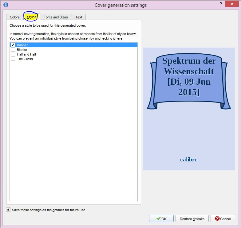 cover_generation.json looks like this: { "cover_width": 1200, "last_used_colors": "Silver", "color_themes": {}, "title_font_family": null, "title_template": "<b>{title}", "subtitle_template": "{series:'test($, strcat(\"<i>\", $, \"</i> - \", raw_field(\"formatted_series_index\")), \"\")'}", "footer_template": "program:\n# Show at most two authors, on separate lines.\nauthors = field('authors');\nnum = count(authors, ' & ');\nauthors = sublist(authors, 0, 2, ' & ');\nauthors = list_re(authors, ' & ', '(.+)', '<b>\\1');\nauthors = re(authors, ' & ', '<br>');\nre(authors, '&&', '&')\n", "cover_height": 1600, "title_font_size": 120, "disabled_styles": [ "Banner", "Blocks", "The Cross" ], "subtitle_font_size": 80, "subtitle_font_family": null, "footer_font_size": 80, "footer_font_family": null, "disabled_color_themes": [ "Grass", "Earth", "Water" ], "last_used_style": "Half and Half" } This leaves "Half and Half" and "Silver" un-disabled and thus selected, and calibre-portable remembers and heeds these settings, but whatever I try, ebook-convert.exe ignores them!? |