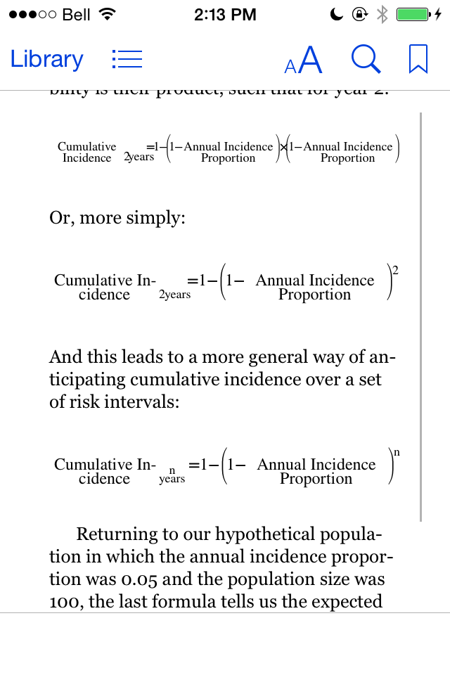 I looked at your long equation in FireFox, iBooks, Kobo for iPad/iPhone, and Gitden Readers. I think the problem is that the equation is just too long. It renders OK in FireFox, but not in the other readers. I suggest abbreviating "Cumulative Incidence" to "CI" and "Annual Incidence Proportion" to "AIP". That would shorten the equation and maybe keep it on one line.