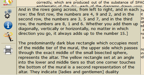 With the following tweaks, can add a url address popup when hovering on wrapped links at the bottom left of the screen, the same way webpages have a status panel to show urls when hovering on links, and works in both single and double page mode: <a id="ebook" href="http://example.com">example</a> + #ebook { position:relative } #ebook:hover:after { content: " " attr(href) ""; display:block; position:fixed; bottom:0px; left:0px; color:#000; max-width:500pt; text-align:justify; word-wrap:break-word; background:#DBD7BD; border:1px solid #777; padding:0px 5px 2px 5px } = (btw see post #6 for an alternate approach) Another option is to use popups as notes, and also use the css equivalent or <br> which is just \a <a id="ebooknote">example note</a> + #ebooknote { position:relative } #eboonote:hover:after { white-space: pre-wrap; /* adding this is needed to use \a */ content: "And in the rows going across, from left to right, and in each row: the first row, the numbers are 4, 9 and 2, and in the second row, the numbers are 3, 5 and 7, and in the third row, the numbers are 8, 1 and 6. Whether you add them up diagonally, vertically or horizontally, no matter in which direction you go, it always adds up to the number 15.] \a \a The predominantly dark blue rectangle which occupies most of the middle tier of the mural, the upper side which passes through the exact middle of the small bisected sphere, represents the altar. The yellow rectangle set at an angle into the lower and middle tiers so that one corner touches the bottom of the mural is a second representation of the altar. They indicate [ladies and gentlemen] duality "; display:block; position:fixed; bottom:0px; left:0px; color:#000; max-width:300pt; /*example screenshot uses this width*/ text-align:justify; word-wrap:break-word; background:#DBD7BD; border:1px solid #777; padding:0px 5px 2px 5px } = and can also have multiple content rules like content: " blablabla \a "attr(href)" \a blablabla" ; OR content: " blablabla \a "url(image.jpg)" \a blablabla " ; OR content: " " attr(href) "\a " url(image.jpg) " "; OR content: " " attr(href) "\a " url(image.jpg) "\a " url(image2.jpg) " "; OR content: " " url(image.jpg) " blablabla \a " url(image2.jpg) " blablabla \a "attr(href) " "; Unfortunately cant have content fetch images like it fetches attr(href), so need unique rules. A few suggestions to that end: 1. specify urls twice with id="" AND alt="" to have the bulk handled by one and content by the other 2. give the unique content important tags, so other urls can keep using generic content 3. add the unique content to the htm/html to keep the stylesheet uncluttered SO in the htm/html would have <a id="ebook" alt="ebook1" href="http://www.example1.com">example1</a> <a id="ebook" alt="ebook2" href="http://www.example2.com">example2</a> <a id="ebook" href="http://www.example3.com">example3</a> <style> a[alt="ebook1"]:hover:after {content: "" url(image1.jpg) "\a " attr(href) " " !important} a[alt="ebook2"]:hover:after {content: "" url(image2.jpg) "\a " attr(href) " " !important} </style> + #ebook { position:relative } #ebook:hover:after { content: " " attr(href) " "; display:block; position:fixed; bottom:0px; left:0px; color:#000; word-wrap:break-word; background:#DBD7BD; border:1px solid #777 } For ebook1 & ebook2 links, will show the url in the bottom left, along with an image directly above it, while the third link will just show the url Last edited by ni_c; 09-28-2015 at 03:44 AM. Reason: even more improved code |