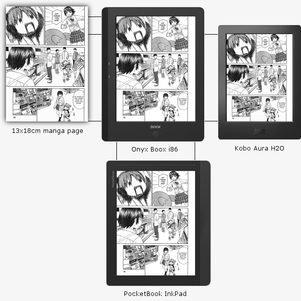 Given the size of a paperback manga (tankōbon 13x18cm, 8 3/4" diagonal, almost 4:3) I'm considering the recent 8" 250 DPI devices: Onyx Boox i86 (HD ML plus) and PocketBook InkPad. The main issue with reading manga on a 6" device is the forced scrolling and/or tiny fonts and drawings, which ruin the entire experience. The 8" devices should allow reading a whole page without any scrolling. Here is a size comparison with a standard manga page and with a 6.8" Kobo Aura H2O: The main pros and cons of these two devices, as far as I could gather, are: