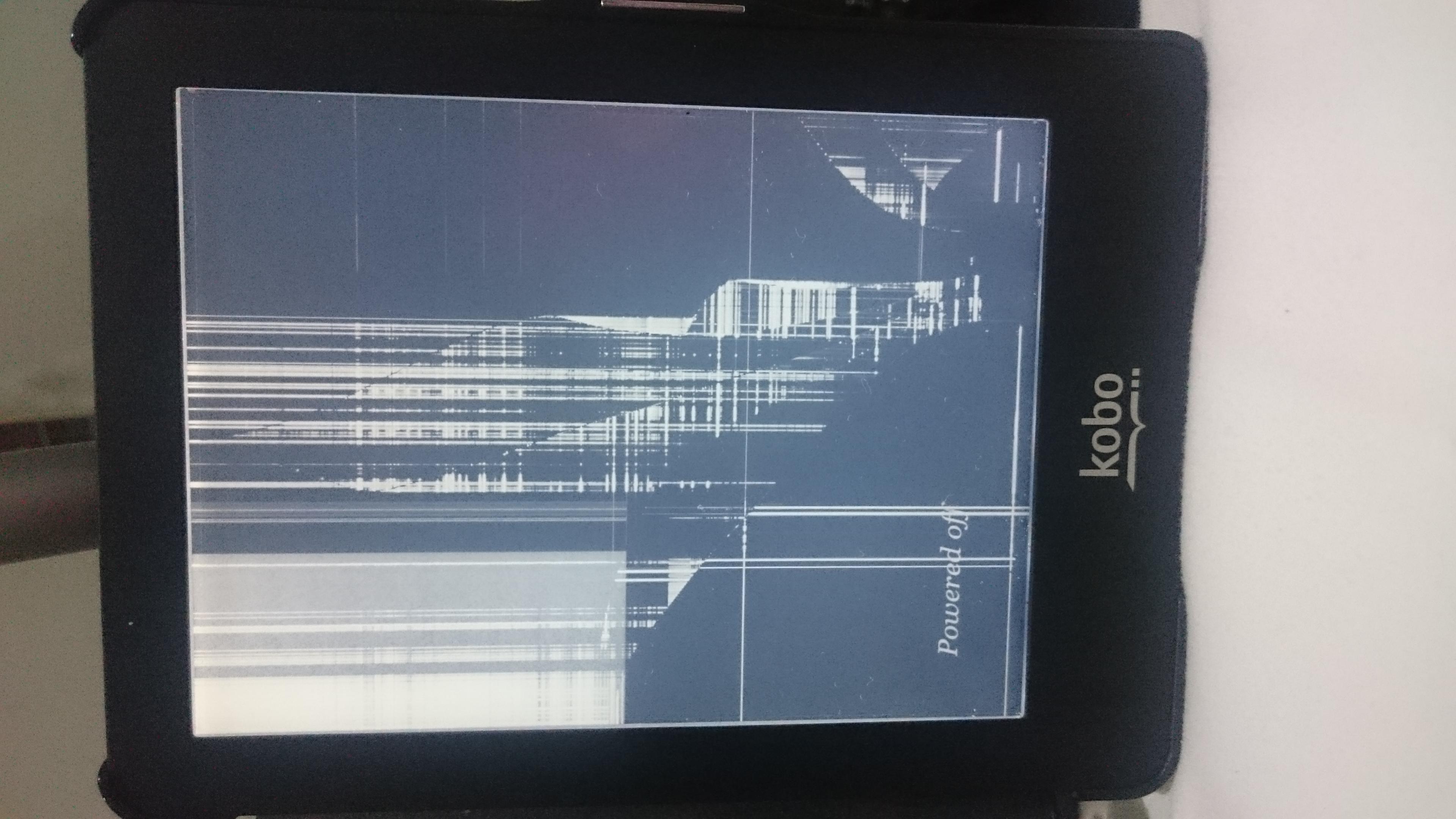Heya. Little (well, not so much) problem with my Kobo. The screen is frozen (see pic). I've tried to turn it off and on again and nothing happened. Tried to reset it as well but it didn't work. I really don't know what else to do. I haven't dropped it or hit it in any way nor did I drop it into water. I've no idea why it froze like this. I've had it since last December. If someone could help that would be amazing. Cheers.