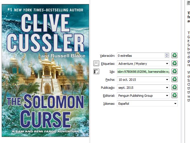 I don't know if this is happening to more people but, lately, a lot of metadata download are wrongly changing the book language from English (the original and right one) to Spanish. I'm not sure if it's related to the data at the sites (although I don't think that so many books have wrong metadata), a change at the data interface or calibre itself. The last book I've looked for (The Solomon Curse - Clive Cussle) give me Spanish language at amazon.com, B&N, Fantastic Fiction and goodreads, and I've set the ISBN. I've tried to run the debug mode, but I haven't found any info at the log. |