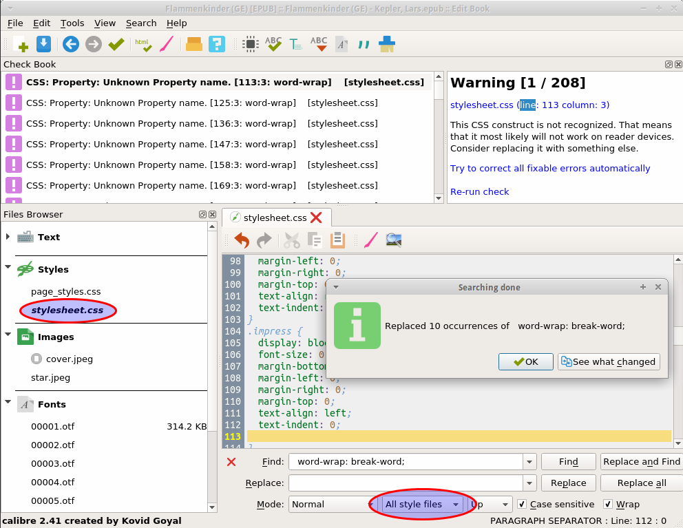 A book got multiple warnings which are all not to correct automatically (via ''Try to correct all fixable errors automatically'', a dozen WARNING: CSS_Property_Unknown Property name. (xxx_x_word-wrap) (stylesheet.css) Description: This CSS construct is not recognized. That means that it most likely will not work on reader devices. Consider replacing it with something else. With what to replace? Can't I delete all these lines showing word-wrap: break-word? and about 200 WARNING: The linked resource template.xpgt does not exist (text_chapxxx.html) Description: The resource pointed to by this link does not exist. You should either fix, or remove the link. I don't know how to fix, but I may remove these links. Yep! The general problem is the sheer mass of warnings. Exist a possibility to correct in bulk? Last edited by chaot; 10-22-2015 at 12:22 PM. Reason: Solution states→Description |