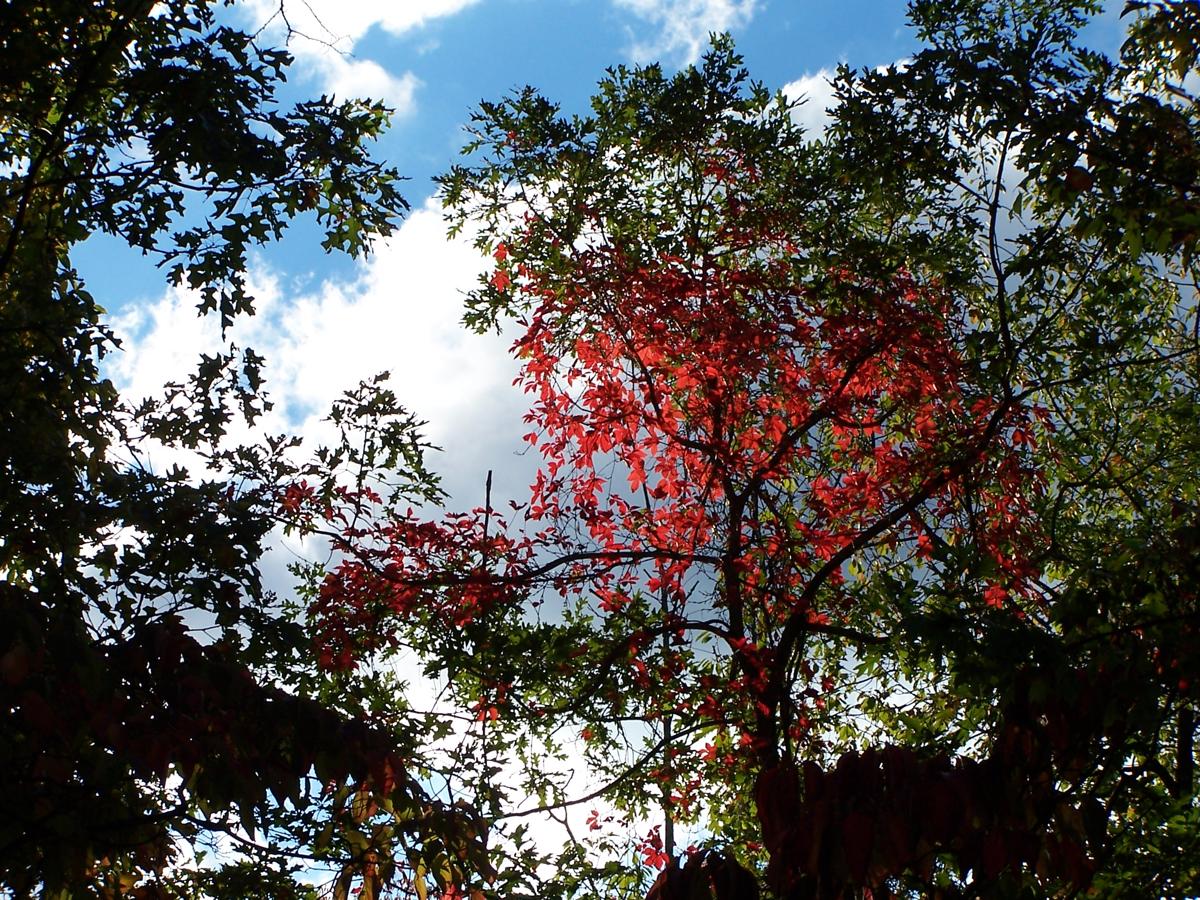 But, we still have some Hickory trees. And, even though the Oak trees are still green, there's a very ambitious Virgina Creeper that's turned red. |