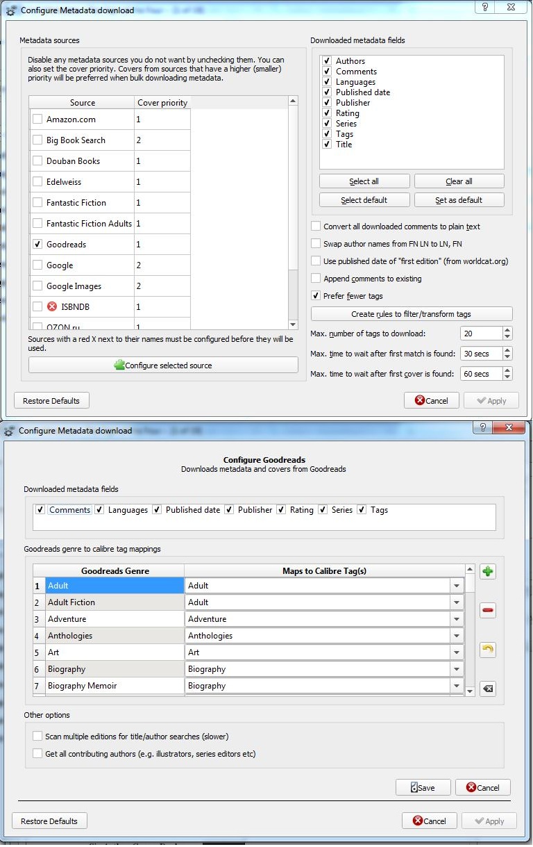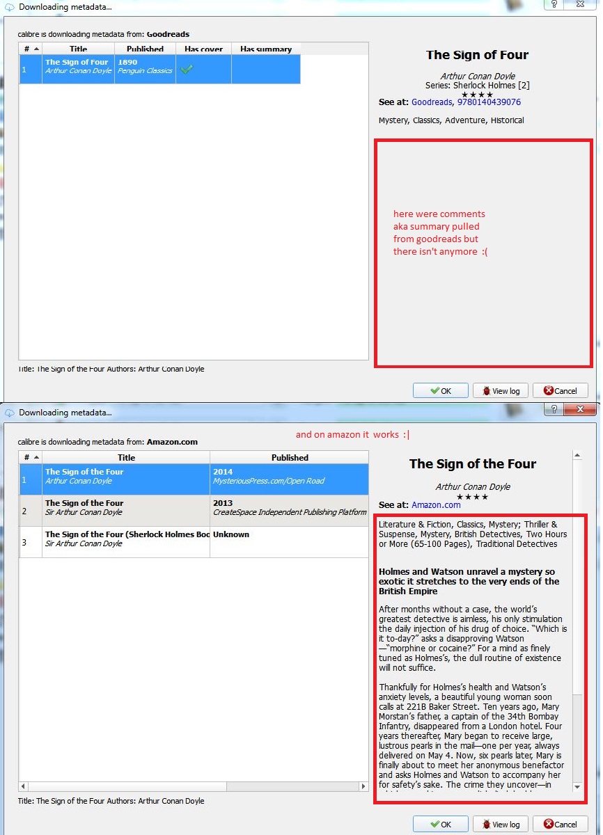 I'm sorry if I should post this somewhere else, I tried searching and unless I should post it under plugin thread this seemed ok place for it. As of 2 days ago, when I download metadata from goodreads, I get everything except summary. Simply, section comment is empty, and when I looked better I figured there is no summary on that screen where I should choose which book if there are more options. I did some print screens in case I can't explain myself well. I also added log from the download metadata when I use just goodreads as source (my preferred method and the one I used successfully till now) and when I use amazon which gives me summary but I don't generally like to use it because of different way of putting titles, and no series sometimes. I just wasn't sure if it would be helpful to have one that works and one that doesn't work for me now. I hope I'm not missing something obvious, my apologies upfront if that is case. thank you |