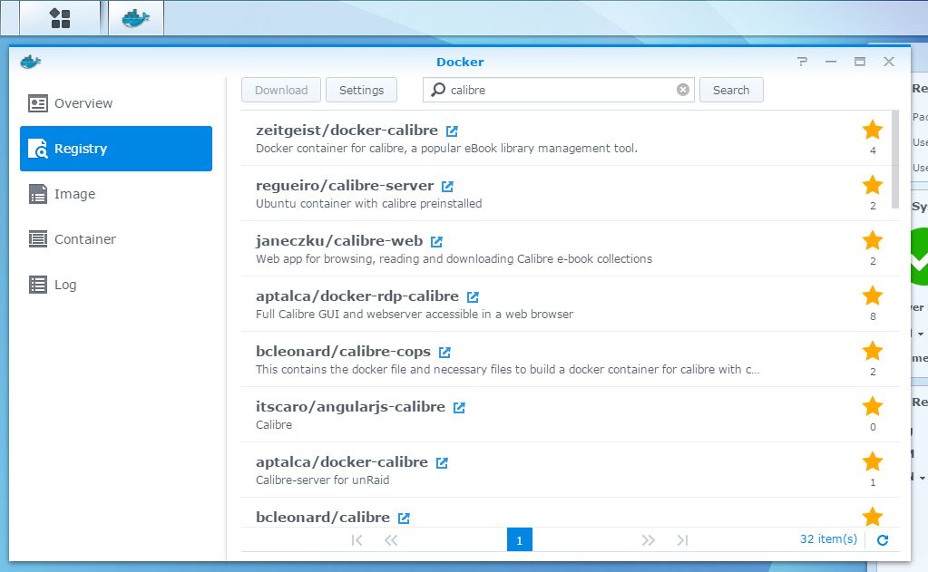 You may follow these steps: Step-1: copy your existing Calibre Library from your PC to Synology Step-2: On DSM (Synology), go to App Center to download Docker Step-3: On DSM, go to Main Menu, find Docker app, and click to run it Step-4: Click Registry tab on the left, type "Calibre" to search for Aptalca/docker-rdp-calibre, click at aptalca...., and click Download button on the top Step-5: Click Image tab on the left, you will see aptalca....image is being downloaded. Wait till the download completed and do the setup before running it. Last edited by bthoven; 01-28-2016 at 12:49 AM. |