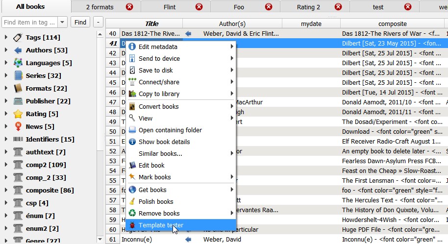 ![]() 1. Would it be possible to validate a template prior to saving it and restarting Calibre? I made a deliberate mistake ( as opposed to my normal ones) and left off a closing brace to see what would happen. It wasn't until it restarted that the error was caught. If it had been validated when I tried to exit, it would have been handier so I could fix it right away 2. Would it be possible to show a preview of the results of the template on the selected book in the template dialog while building it so the user could get a feel for the results? Might be helpful for the new or occasional template creator. 3. After Calibre restarts, the Virtual Library I had open before restarting, is no longer open, and it defaults to All. If I had a VL open when I closed, could (option maybe) the same VL be selected when I come back? Last edited by phossler; 01-12-2016 at 11:43 AM. |