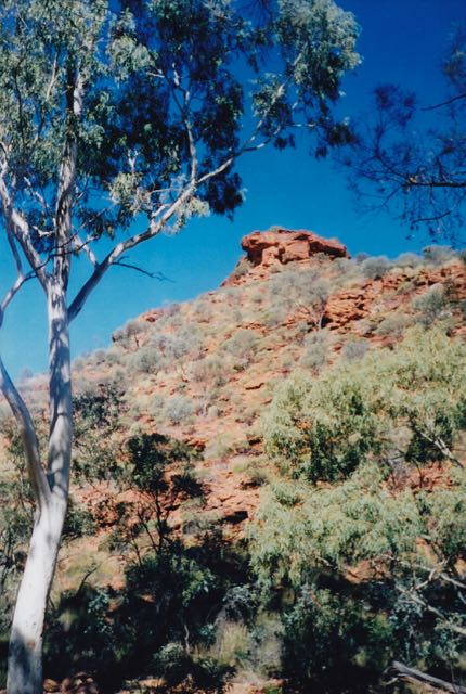 Then he goes on to talk about the Ghost Gum, which is found in the centre of Australia and looks particularly striking in contrast with the red soil there. The second photograph shows one in King's Canyon. |