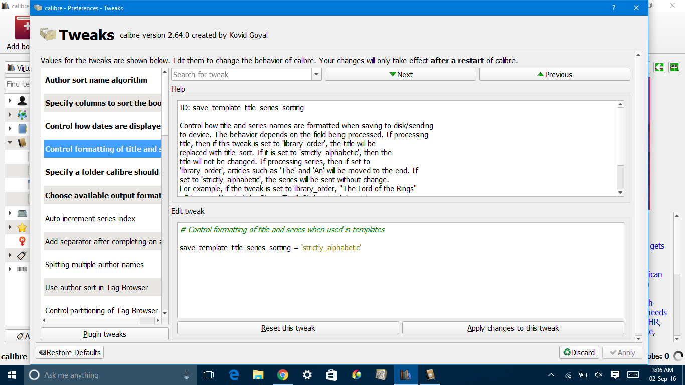 Hi I have been using calibre for a while and know that title and title sort are made identical by putting in strictly alphabetical order in the tweaks. But unfortunately after migrating to a new laptop a. The title sort is omitting leading characters and when trying to do manually shows up pink. Also a new column is showing up saying device. Could it be because i have synced to a cloud and how to suppress it?tia