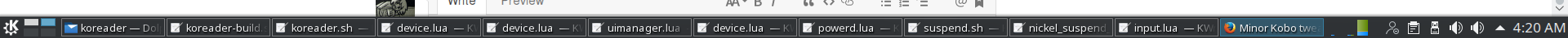 But over USB, both ends defaults to a slightly more obscure private subnet because it doesn't (and shouldn't, to keep things sane) be in your subnet. You really only need to change the USB IPs if you are indeed risking mismatches. But over WiFi, either you know the IP because you set it manually (advanced network setup on the Kindle), or it's assigned by your router via dhcp, and you get it either from your router (I'm assuming config UI and/or network topology maps available somewhere), or from the 711 (or 411?) page on the Kindle. (I'm not mentioning the defaults to avoid confusion, because I, weirdly enough, don't use the defaults on my setup for portability purposes between legacy kindles, kindles and kobos ![]() Take all that with a grain of salt, I've been bashing my head against mystical Kobo issues all day, so my sanity is a bit frayed ^^. That's my systray right now. Yes, I was optimistic at the beginning, I went with kwrite instead of kate, and now I have seventy billion windows open instead of one, and it's a mess ![]() Last edited by NiLuJe; 02-29-2016 at 10:23 PM. |