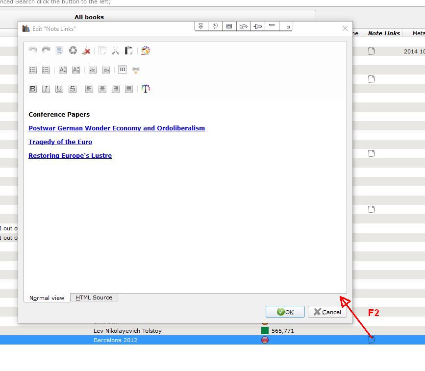 Window can be stretched to full screen if I'm minded. The white 'page' icons in the book list indicate the Note Links cell is non-empty. BR |