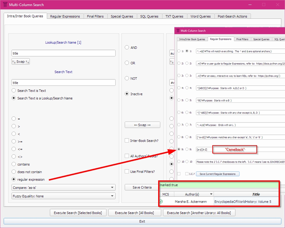 I'm trying to use a regex in the Advanced Search to find any lower case letters in the titles that are immediately followed by a capital, to find titles like "AnUnknownBook"