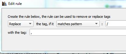 I just ran another test. I have to wonder if you actually tested a Replace/Matches Pattern rule. As set up, that only works for a tag that is ONLY a forwardslash / . I created a tag " / " . I easily replaced that with just a comma using Matches Pattern. BUT, I'm talking about a forwardslash that is CONTAINED IN A TAG EXPRESSION. Therefore, there has to be something else to code to convey this. A simple SPACE/SPACE and comma replace works with Search and Replace, but it doesn't work in the Tag Mapper which is the preference as my rules will "fix" the items such separation would create so I'd like it to be automatic vs the Search and Replace method that would require running it on tens of thousands of entries all at once since it would be more time consuming to "find" tags expressions containing this. Last edited by jecilop; 04-12-2016 at 10:00 PM. |
