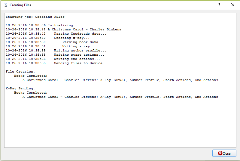 I've created a Calibre plugin that creates and sends x-ray files to kindle. Some background information on X-Ray and other Kindle Files: X-Ray allows you to get information on key characters and terms from shelfari. You can do this in one of a few ways. 1. You can highlight the word in question and if the x-ray file has information on it, a popup with a brief description will show. It will also show you where this character has been mentioned in the past (will show page number and excerpt where mention occurred). 2. You can click X-Ray and search for the word either by looking through the list or using the search bar. Clicking on the word will show you the same popup from #1. It also has a notable clips section which show quotes from shelfari. If there are not enough shelfari quotes found, the plugin will add more random excerpts so there are least 20 notable clips. Author profiles allow you to see information on the author such as a bio, other books by the other, etc. You can see this by going to "About the author" on the menu while the book is open. Start actions show you a description of the book along with other information such as the reading time and the rating (retrieved from Goodreads). It will also allow you to mark the book as currently-reading on Goodreads but you need to be signed into Goodreads on the device and you need to have wifi enabled and connected for this to work. There will be a pop-up showing you this information when you open a new book but you can also see it by going to "About this book" on the menu while the book is open. End actions show you recommendations for other books based on the current book (retrieved from Goodreads). It will also allow you to mark the book as read on Goodreads but you need to be signed into Goodreads on the device and you need to have wifi enabled and connected for this to work. There will be a pop-up showing you this information when you reach the end of the book. Note: These files work only work on Amazon products such as the Kindle PW. For more information on X-Ray files, see here: http://www.amazon.com/gp/help/custom...7-239A35EB4119 Github Page: https://github.com/szarroug3/X-Ray_Calibre_Plugin This plugin will allow you to: 1. Set book specific preferences (This screen may take a while to open if doesn't have the ASIN and shelfari url set in the settings already as it will be searching for them; Use "," or ", " as a separator for words in aliases list) Auto associate split aliases, when enabled, will split aliases up. For example, if a character on goodreads named "Vin" has a Goodreads alias of "Valette Renoux", this option will add "Valette" and "Renoux" as aliases. You may not want this in cases such as "Timothy Cratchit" who has a Goodreads alias of "Tiny Tim". Having this feature on would add "Tiny", and "Tim" as aliases which is not valid. Input JSON must have format shown in "JSON Template" section below 2. Create/Update x-ray files for selected books3. Send previously generated x-ray files to device Note: Creating an x-ray file using this plugin will automatically search for and use the correct ASIN so you don't need to search for it. Note: Highlighting words should work but I have not tested with a book that has DRM so I don't know if it will work for them. JSON Template: {"characters": {"Character1 Name": {"description": "Character1 Description", "aliases": ["Character1 Alias1", ...]}, "aliases": ["Character1 Alias2", ...]}, "settings": {"Setting1 Name": {"description": "Setting1 Description", "aliases": ["Setting1 Alias1", ...]}, "quotes": ["Quote1", "Quote2", ...]} Preferences: 1. Send files to device if connected - After creating files, files will automatically be sent to device 2. Create files that don't already exist when sending to device- When sending previously generated files, files will be generated for selected books that haven't already been created 3. Auto associate split aliases, when enabled, will split aliases retrieved from Goodreads up- i.e If a character on goodreads named "Vin" has a Goodreads alias of "Valette Renoux", this option will add 4. Overwrite local files that already exist when creating files"Valette" and "Renoux" as aliases. You may not want this in cases such as "Timothy Cratchit" who has a Goodreads alias of "Tiny Tim". Having this feature on would add "Tiny", and "Tim" as aliases which is not valid. - When using the Create/Update Files function, this will decide whether or not to delete local files that already exist 5. Overwrite files on device that already exist when sending files- When using the Send Files function, this will decide whether or not to delete files on the device that already exist 6. Files to create/send- This will let you choose what type of files to create and/or send - You must choose at least one. 7. Book types to create files for- Selection of formats to consider when creating and sending files. - You must choose at least one. 8. If device has both (mobi and azw3) formats, prefer- This will choose which format to send files for if your device has both file formats - This matters because there are offsets in the x-ray file that determine whether something that is highlighted is part of the x-ray - If you are sure you only have one format of the book type on the device, this does not matter. Theming: You can place a file at "\calibre\resources\images\X-Ray Creator\icon.png" (in your calibre application directory) to the plugin's icon. Testing: This plugin has been tested using a Kindle PW2 on Windows 10 and Linux. I am still working on testing some portions of it so if you do find a bug or want to request a feature, please let me know via Github or Mobileread. Here are some screenshots of the plugin in action: Plugin will show up on your toolbar (if you enable it - remember: when device is connected, there is a separate toolbar) You can set general preferences You can set book specific preferences Plugin will add job to job manager Plugin will list execution, succ