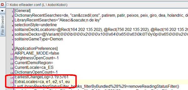 2.- We need a two chars code for each dictionary. If language doesn't exists on Kobo we can use its ISO-639-1 (Ex: Catalan => ca. Euskera => eu), otherwise we will assign a new fictitious code (Ex: English => e1, e2 . Spanish => s1) 3- Edit \.kobo\Kobo\Kobo eReader.conf and fill ExtraLocales=xx in [ApplicationPreferences] seccion with the two chars code of the dictionaries to install (separate with commas) ExtraLocales=ca, e1, e2, s1, eu 4.- Copy dictionary files to \.kobo\dict You have to name the files with the file structure of kobo dictionaries with the two chars code. dicthtml-ca.zip, dicthtml-e1.zip, dicthtml-e2.zip, dicthtml-s1.zip, dicthtml-eu-es.zip 5.- From fw 4.22 step 5 is no longer necessary 6.- Safely disconnect the reader and restart. You have the new dictionaries. You can use on the book and from the menu dictionary of the home ![]()