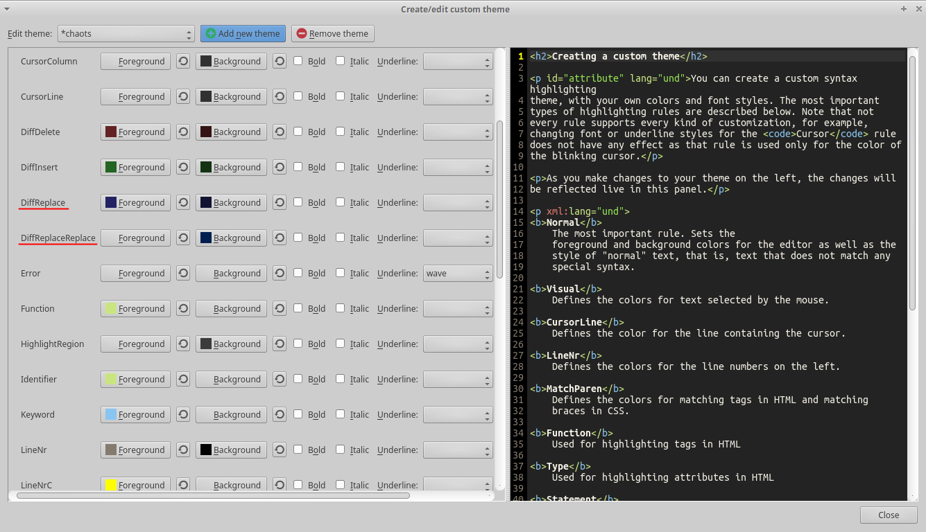 I'm not totally sure of what all the items in 'Create/edit custom color schemes' are, either.