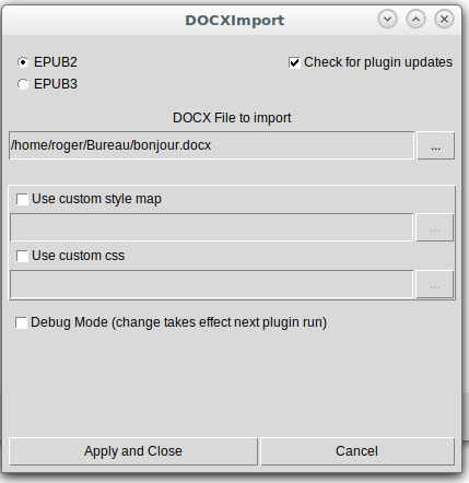 (based on Writer2LaTeX) Current Version: "0.5.0" This plugin is a very simple Writer2xhtml 1.7.1 wrapper, which allows you to import OpenOffice ODT files. The author of Writer2xhtml is Henrik Just. Credits: Since I'm not that familiar with the ODT file format and Writer2LaTeX, I asked st_albert for help with the configuration and stylesheet files and he kindly provided sample configuration/stylesheet files (config.xml and epub.css) as well as an ODF text document template file (custom-styles.ott). If you want to test the template file, unzip Custom-Stylesheet.zip and add the custom styles in LibreOffice/OpenOffice via Styles > Load Styles > From file > ODF Text Document Template > custom-styles.ott. This will add a number of custom styles that all start with custom, e.g. custom-body-text. Note that these styles are not intended as all purpose styles, they're merely provided to demonstrate how to map custom styles to stylesheet classes. For example, the following line in config.xml maps the LibreOffice/OpenOffice custom-body-text style to the p.custom-bodytext class in epub.css. Code: