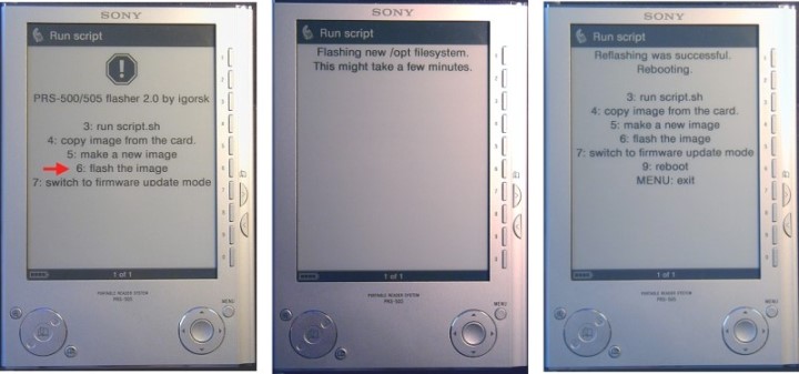 Falls jemand gravieredende Fehler entdeckt, bitte postet diese und helft mit, die Übersetzung präziser zu machen. Meine Englischkenntnisse sind zwar recht gut, aber über technische Begriffe stolpere ich doch schonmal. TIPP: Bevor ihr mit der beschriebenen Installation beginnt, lest euch die Anleitung bitte einmal VOLLSTÄNDIG durch. Dies ist eine Flash-Anleitung und ich möchte nicht für evtl. Schäden (aus Nachlässigkeit des Users) verantwortlich gemacht werden! --- Nun denn: ANLEITUNG NR. 1 PRSCustomizer v0.03 ist ein leicht zu bedienendes Programm für den Sony PRS-505 Reader. Es bietet folgende Features: Uhr Anpassung der Sprache by Porkupan (englisch, französisch, deutsch, russisch, spanisch) Unicode Fonts mit Cyrillic Support Einheitliche Schriftgröße (optional) Mehrere Icon-Sets (optional) Shutdown per Knopfdruck (optional) Umblättern per Navigationstaste (optional) Personalisierter "About"-Screen Vier Versionen werden angeboten: prscustomizer.exe: Windows prscustomizer: Linux GTK prscustomizer.app: OS X Universal Binary prscustomizer.py: Python/wxPython - All Platforms In short, most of the hacks that have been discussed without the effort of making changes in the xml files ( <= Versteh den Satz nicht, scheint aber auch nicht sonderlich erheblich für die folgende Anleitung zu sein). Als erstes entpacke das Zip-Archiv in das Root-Verzeichnis einer leeren SD-Karte. When du das für dein Betriebssystem passende Programm lädst, werden drei Felder erscheinen: Name, Telefon, Email. Trage hier die erwünschten Angaben ein. Die drei Kontrollkästchen (durch Voreinstellung alle angekreuzt) bestimmen welche optionalen Hacks auf deinem PRS-505 aktiviert werden. Die Dropdown Combobox (Dropdown-Menu?) legt fest, welche Icon-Sets auf deinem Reader installiert wird. Voreingestellt ist das ursprüngliche Sony Icon-Set. Wenn alle oben aufgeführten Einstellungen vorgenommen wurden, betätige den 'Customize'-Button. An diesem Punkt ist die Installation fast abgeschlossen. Entferne nun die Speicherkarte von deinem PC und stecke sie in den SD-Slot deines Readers. An dieser Stelle wird "Igorsk's Universal Flasher" starten (in der Zip-Datei enthalten). Wähle Option #5, dann Option #6. Nach einem Neutsart sollte der Vorgang abgeschlossen sein - und du einen "customized" PRS505 in Händen halten. Falls du deinen Reader kürzlich schon einmal angepasst hast, musst du vermutlich einen Reflash mit dem "Sony PRS-505 Updater" durchführen, BEVOR du die hier angebotene Software verwendest. Der Grund dafür ist ein kleiner Programmfehler im Flasher, dessen Existenz sich Igorsk bewusst ist. Eigentlich ist es sogar das Beste, in jedem Fall zuerst den "Sony PRS-505 Updater" zu starten, bevor du das hier angebotene Programm verwendest. -- Der Urheber dieser Anleitung (JeffElkins) schreibt weiter: Hast du einen neuen Hack entdeckt? Bitte lass es mich wissen, damit ich dies für eine Integrierung in den PRScustomiser in Betracht ziehen kann! Dies ist freie Software nach GPL V2. Benutzung auf eigene Gefahr. Als zusätzliche Anpassung (customization), die nicht in diesem Programm enthalten ist, kannst du "per Hand" das Reader-Logo verändern. Dafür benötigst du einen Grafik-Editor wie Adobe Photoshop oder Gimp. In dem Verzeichnis "prsfiles" findest du zwei Dateien (files): "logo.png" und "kBookAssets.png". "logo.png" ist eine 210x70 Datei. Füge deine personalisierten Details in die Datei ein und kopiere sie in die obere linke Ecke der "kBookAssets.png"-Datei, so dass diese den großen Schriftzug "Reader" verdeckt. Speicher die modifizierte Datei als "files.505.1.1.00.18040/opt/sony/ebook/application/resources/scripts/kBookAssets.png" und du dürftest ein angepasstes Logo haben! [Für diesen letzten Abschnitt nehme bitte die ursprüngliche Anleitung zur Unterstützung! Ich bin mir nicht ganz sicher, ob ich es zu 100% richtig übersetzt habe..] +++ Ende +++ ANLEITUNG NR. 2 ("readme"-File im Zip-Archiv) PRS-500 and PRS-505 (Sony Reader) universal flasher v 2.0 2008/07/26 by igorsk * Beschreibung Dieses Set an Scripts ermöglicht das Flashen eines "Custom Image" (?) oder das Ersetzen jeglicher Datei im "/opt"-Verzeichnis des Reader-Dateisystems, wofür lediglich eine Flash-Karte benötigt wird. Das "/opt"-Verzeichnis enthält "the main Reader UI (<= User Interface?) and supporting files" (?). Es gibt verschiedene Verwendungsmöglichkeiten: 1) die Firmware zu einer älteren Version zurückspielen 2) Anpassung des Looks und Verhaltens der UI (<= User Interface?) 3) Ersetzen und Hinzufügen eingebauter Fonts (Schriftarten?) Beispielsweise fügen enthaltene xml-Files der Stausleiste des Readers eine konfigurierbare Anziege der Uhrzeit hinzu. * Benutzung 1) Entpacke das Zip-Archiv auf einer Flash-Card unter Beibehaltung der Verzeichnisstruktur. Das Beste ist, eine Karte zu benutzen, die nicht zu viele Dateien enthält, so dass der Reader diese schneller scannen kann. P.S. readme.txt sollte im root-Verziechnis der Karte sein, in keinem anderen Unterverzeichnis! 2) Lege Karte in den Reader ein. 3) Warte bis das "Run Script" auf dem Bildschirm erscheint. 4) Press 5. Warte auf die Bestätigungsnachricht... success message... (Der Prozess dauert 1 bis 2 Min. 5) Press 6. Warte auch Bestätigungsnachricht... success message... 6) Press 9 um zu rebooten. 7) Extract the card ( <= Entnehme die Karte?). * Benutzung der Uhrzeit-Anzeige Um die richtige Uhrzeit auf dem Gerät PRS-500 einzustellen, musst du es an den PC anschließen und die eBook Library Software nach jedem Reset neu laden. Es sollte auch mit "libprs500" oder "Calibre" möglich sein. Was den PRS-505 betrifft, kannst du die Uhrzeit unter "Settings" einstellen oder das Gerät an den PC anschließen, um dies mit der verwendeten eBook Library Software zu tun. Um das 12/24 Std. Format einzustellen oder die Uhr abzustellen, verwende "Settings -> About" und dann den Knopf "0" (überprüfe Einstellung in der Statusleiste des Readers). * Andere Verwendungsmöglichkeite