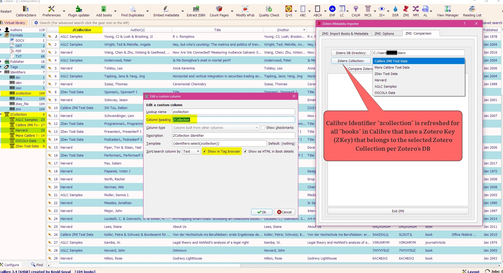 Version 1.0.3 - 2016-06-22 New: Detects Keys for Zotero books that do not exist anywhere in Calibre in the ZKey (#zotero_key) Custom Column and also not anywhere in the Identifiers table, and offers to run calibredb to auto-add them. Calibredb then adds the book while also adding an Identifier of zkey with a value of the CSV key to the Calibre book. Automated matching of the Identifier zkey with the CSV to automatically update metadata from Zotero is then possible.  See the attached explanatory image. An important note: The Zotero CSV file field "file attachments" must correspond exactly to the path of your Zotero books (file attachments). If you get virtually a zero % success rate in automatically adding the Zotero books to Calibre, you should strongly suspect that the data in the CSV field "file attachments" does not exactly equal the path of your Zotero books in your OS. Check for non-displayable characters in the CSV that of course do not exist in the paths of the books, making finding the books via the CSV file attachments field impossible. DaltonST |