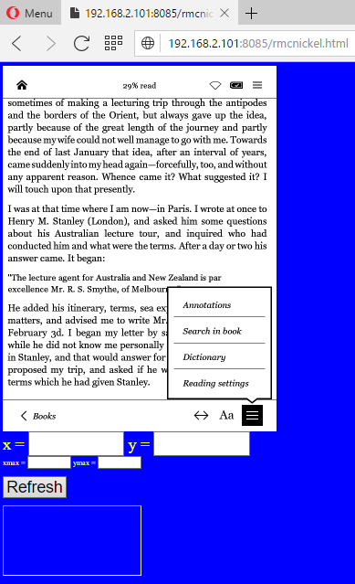 If you want to try this on another model: Follow the instructions from above. See whether the device reacts at all when you click the image. Try different locations and watch the screen (of the Kobo). If there is no reaction at all, give it up for the moment. If there is some reaction, but the location is wrong (for instance, you click the image somewhere in the top left corner, but the device reacts as if you touched the top right corner), you can try something: The image in the browser is treated as if the origin of the coordinates (x=0, y=0) were in the left top corner. On the Touch C (and of the Glo), however, the origin (x=0, y=0) of the screen coordinates is in the right top corner, therefore the x and y values have to be mapped accordingly. The script does this already. As for the other devices, I do not know where the origin is located. You have to find it out yourself. If you have a guess you can try it by giving the origin as an argument to the url, e.g., http://192.168.2.101:8085/rmcnickel.html?origin=TL. Possible values for origin are: TR, TL, BR, BL. They stand for "top right," "top left," "bottom right," "bottom left." If this results in success, please post the value in this thread together with the values for xmax and ymax (which you can find on the page in the web browser). Now back to Touch C, and Glo. You can use the remote control also for KSM. However, there the image is rotated to the left (see x_rmc_ksm_01.png), and you have to set another origin (http://192.168.2.101:8085/rmcnickel.html?origin=TL). It works also for PbChess/CoolReader. It does not work (or does not properly work) for Koreader. Last edited by tshering; 10-01-2016 at 04:19 PM. |