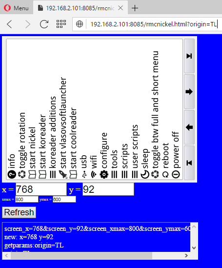 If you want to try this on another model: Follow the instructions from above. See whether the device reacts at all when you click the image. Try different locations and watch the screen (of the Kobo). If there is no reaction at all, give it up for the moment. If there is some reaction, but the location is wrong (for instance, you click the image somewhere in the top left corner, but the device reacts as if you touched the top right corner), you can try something: The image in the browser is treated as if the origin of the coordinates (x=0, y=0) were in the left top corner. On the Touch C (and of the Glo), however, the origin (x=0, y=0) of the screen coordinates is in the right top corner, therefore the x and y values have to be mapped accordingly. The script does this already. As for the other devices, I do not know where the origin is located. You have to find it out yourself. If you have a guess you can try it by giving the origin as an argument to the url, e.g., http://192.168.2.101:8085/rmcnickel.html?origin=TL. Possible values for origin are: TR, TL, BR, BL. They stand for "top right," "top left," "bottom right," "bottom left." If this results in success, please post the value in this thread together with the values for xmax and ymax (which you can find on the page in the web browser). Now back to Touch C, and Glo. You can use the remote control also for KSM. However, there the image is rotated to the left (see x_rmc_ksm_01.png), and you have to set another origin (http://192.168.2.101:8085/rmcnickel.html?origin=TL). It works also for PbChess/CoolReader. It does not work (or does not properly work) for Koreader. Last edited by tshering; 10-01-2016 at 05:19 PM. |