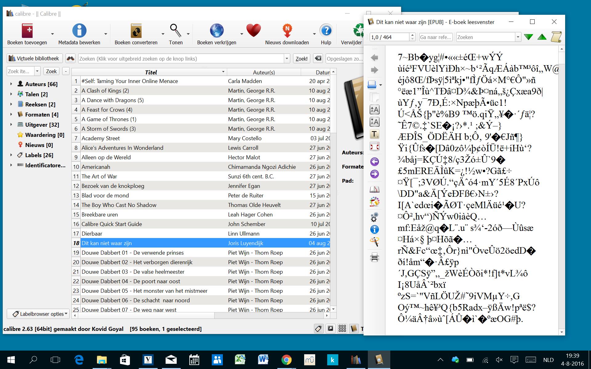 we own a Kobo Aura e-reader. In order to be able to read Kobo and other e-books on more devices, I installed Calibre on my Win8 (now upgraded to Win10) laptop computer. I also installed the Windows Kobo app, to download the Kobo books to my laptop. In Calibre I use the book import function to get the books in my Calibre library. I imported the first few books individually, after that I used mass import. Last time I did that was June 26, 2015. After that, I imported individual kobo books. Now it appears that the books imported after June 26, are not readable. See the attached jpeg image. I tried several Calibre versions, both 32 and 64 bit, both recent (2.63) and older versions (1.48). I also tried to USB connect the Kobo Aura to my laptop, but did not succeed to download/store any of the books that way. |