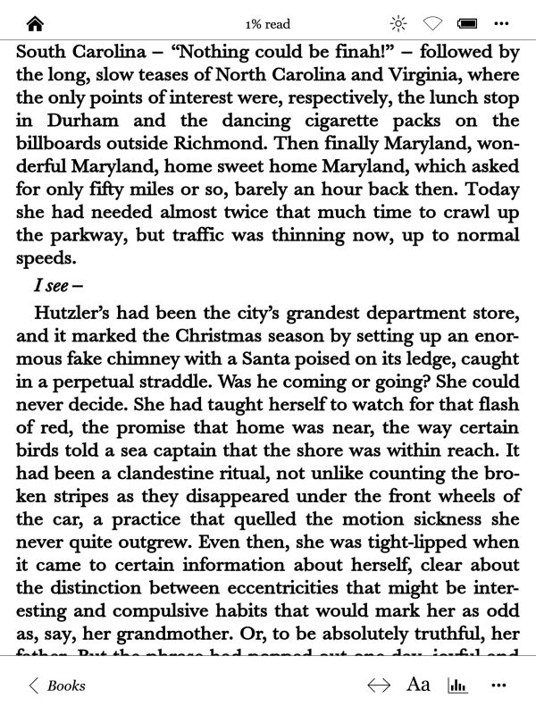 In the last few days I've been tinkering with pipcat's alternative method for patching the nickel file. I discovered that it's currently quite easy to reduce the height of the top menubar. See attached images for example. First image: a typical kepub page on an AuraOne with GeoffR's 'Custom Footer' patch plus my 'Reduce Header by 33%' patch. Second image: same page when tapped to show top and bottom menus. Without the 'Reduce Header' patch both top and bottom menubars are 13mm in height. With the extra patch the top menubar is 8.5mm. In truth the height could be reduced to any number of pixels you like, but I chose reducing by 33% as a first stab. What I'm not sure about is whether those who describe the top header in kepubs as 'waste' are more than happy to just use the 'full-screen' option. In which case I won't bother pursuing this. If there is any interest I can use GeoffR's makepatch utility to create a suitable 4.1.7729-specific addition to nickel.patch |