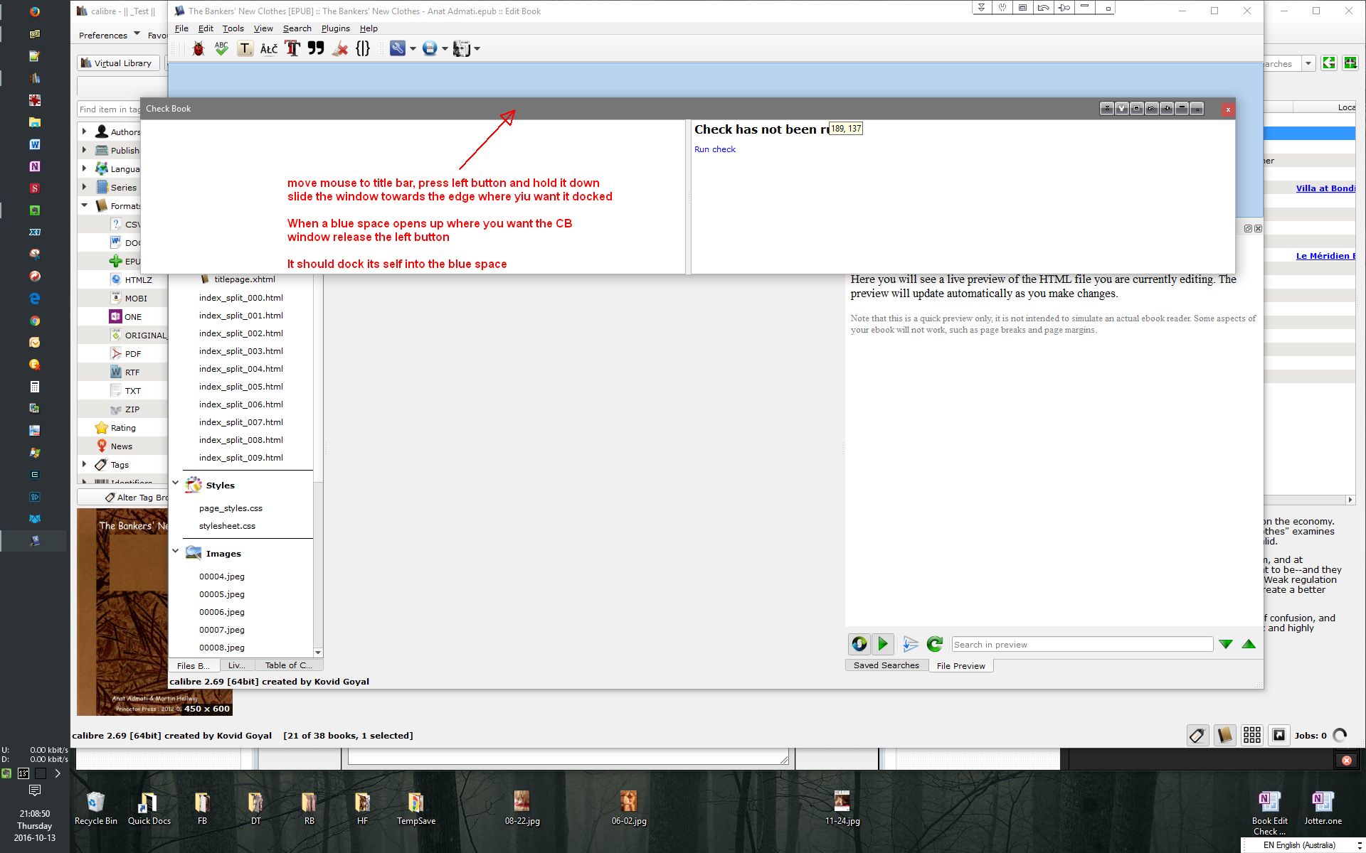 When I turned it back on, it no longer docks, but sits at the top of the screen over the other windows so that I can no longer see the top of the document for example. Even the scroll bar at the far right is covered. I've tried deleting all the "View" items then re-starting them again in various orders, but nothing seems to make the "Check Book" dock properly. I'm guessing a re-install might/should cure the issue, but I thought it worth mentioning. Colin |