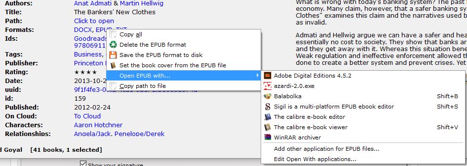It's also not as easy to edit different formats...you have to explicitly pick the format first, while the "Open with" plugin limits choices to only the formats that exist. And, although you can right click on the cover and do "Open With", that is again in a different location than the formats...it's a lot of mouse moves, and the plugin doesn't require nearly as much. The last bonus for the plugin is that I don't have to clutter up my Windows "Open With" list on eBook formats so that Calibre can see them. 90% of my use case for Sigil is for EPUB container maintenance (file renaming, file splitting/merging, TOC editing, etc.) and the rest is for the "Delete unused" features, so the CSS editing bug only hits me once every few months. |