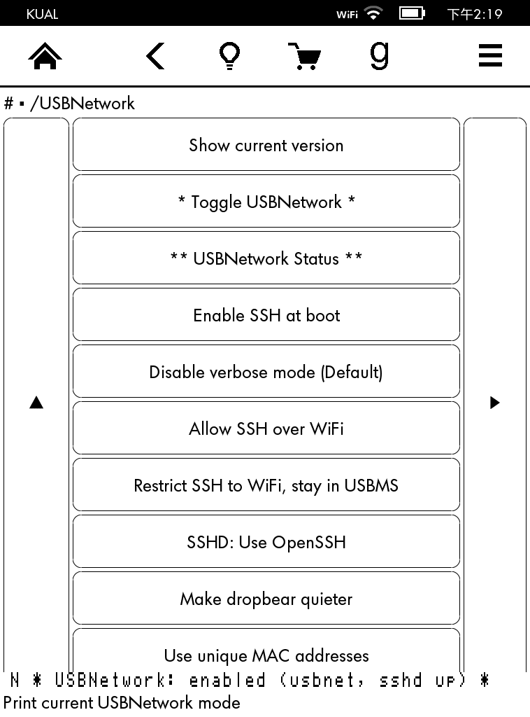 System: 5.4.2 Status: Jailbroken; USBNetwork, MRI, Kindle Explorer and some other small hack installed Issues: 1. It was a long time ago (maybe 1 or 2 years) when I got the kpw2 jailbroken and installed these hacks. I had a hard time toggling USBNetwork and find someone's guide to use SSH over wifi, using the "authorized_key" (like this one). It worked at first. Then strange things happened: the kindle couldn't connect to PC by usb. Just charging. No matter what OS (Win xp,7,8,10 or Ubuntu&Fedora) and cable I use. I can't remember well what's the cause, and it remains the same now. I thought maybe it has stayed in usb-ssh mode, but it didn't shows up in windows network adapter, connecting to 192.168.15.244 in SCP/SSH no luck, and using some command lines in Linux showed no usb0 or something like that... I just gave up. 2. However, with Personal Documents I can still read the books in kindle fine. Kindle Explorer ensures the ability to edit files. And another weird thing also helps me: I can access the files over wifi-ssh, although I've already deleted the authorized_key file in kindle and use no privatekey.ppk in my computer. I just toggle the USBNetwork on, and type in kindle's ip address in WinSCP, username root, no password. I don't know if this is normal behavior. Using putty's SSH command line is also okay. But I've always been wanting to update (after hearing jailbreak survives the update with some bridging), and if the update will disable jailbreak at first, I will not be able to transfer the bridging file to the kindle. So I still want to fix the usb issue if there's any hope. Note: the config file in the kindle shows SSH over wifi is disabled (the introductory texts have been deleted): Code: