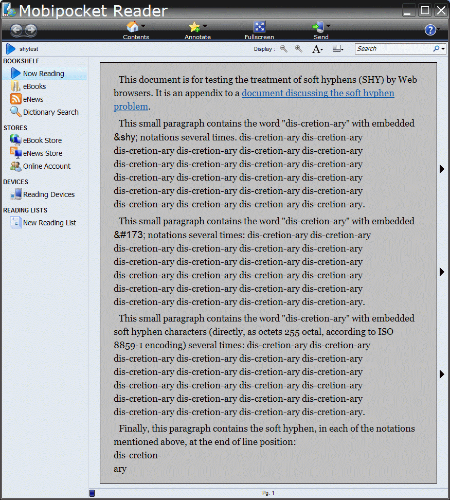 The attached ebooks are based on http://www.cs.tut.fi/~jkorpela/shytest.html, which is from Soft hyphen (SHY) – a hard problem?. I enclose a single-file HTML (ZIP), MOBI (via MobiPocket Creator) and ePub (via BookGlutton) versions. The screenshots are from a Windows PC using Adobe Digital Editions, Sony Ebook Library (PRS-505 like), MobiPocket Reader, FBReader and uBook. The uBook version (last screenshot) appears to do the best job, but it does not display the "-" when a soft hypen is positioned at the end of a line in the actual document and it might in fact be ignoring all the soft hyphens and using its own hyphenation (it can give discre-tionary, which isn't from the soft hyphens). Adobe Digital Editions (ePub) breaks on a soft hyphen, but does not add a "-" when it does so. Sony is based on ADE, it breaks on a soft hyphen but it also shows "?" at every soft hyphen. MobiPocket shows all soft hyphens as "-" and does not break words. FBReader does break words, but shows all soft hyphens as "-". Soft hyphens could provide a viable alternative (or augmenation) to on the fly hyphenation, but only if ebook readers either use them for hyphenation or ignore them completely. |