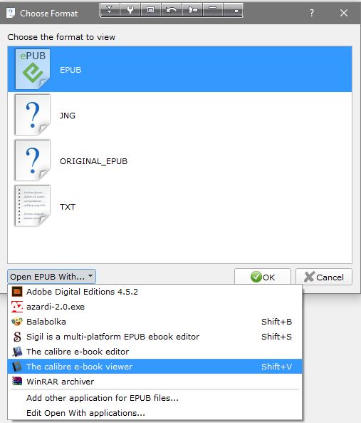 But I took the opportunity of trying the new built in Open With, it works more like an OS Open With (but better, than Windows at least), where you configure each file type (format) separately. Below you see my Open With list for ePUBs, all I had to do was to point calibre at the relevant programs.