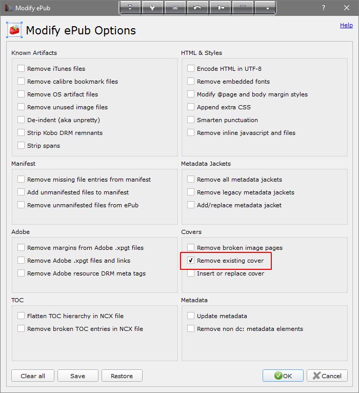 Could you post a screen shot of the EPUB->PDF conversion you ran? Just the Metadata panel, viz: What happens if you remove the cover from the EPUB before you convert it to PDF? The Modify ePub plugin can do that for you, viz: What cover do you get if you do an EPUB->EPUB conversion, before you do the EPUB to PDF conversion - do not put anything in Change cover image: and do not check Use cover from source file ? BR Last edited by BetterRed; 12-30-2016 at 07:54 PM. |