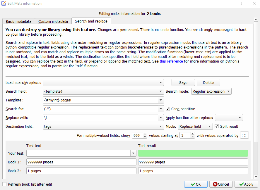 I'm trying to write a bulk search & replace to replace the tags column with #pages " Pages" (To look like 228 Pages" in the tags column that's otherwise empty). What I have is: Regex: search field = tags Search for: \* Replace with: #pages " Pages" Destination field: tags It sees the tags field ok but just repeats it in the destination field. I've tried different replace with and nothing works. I've also tried in on books with a blank tags field. Thanks |