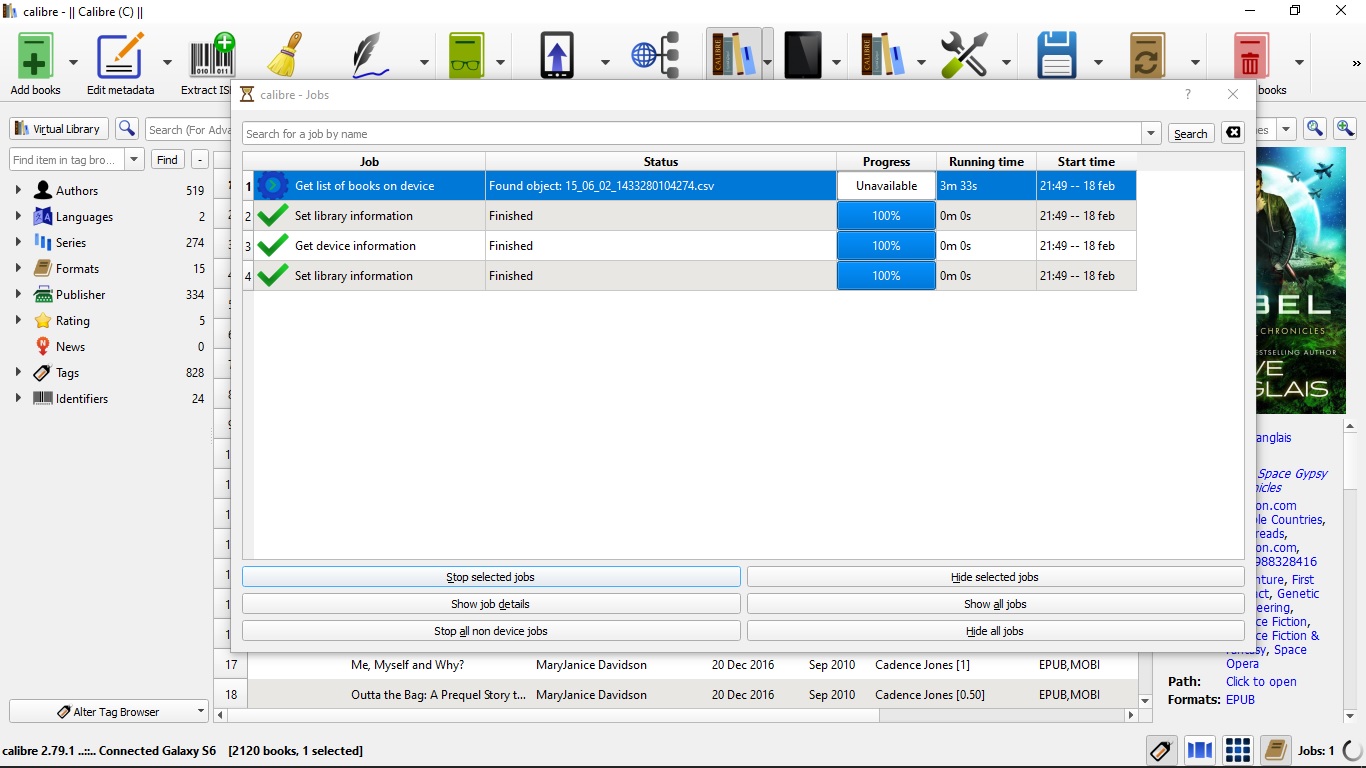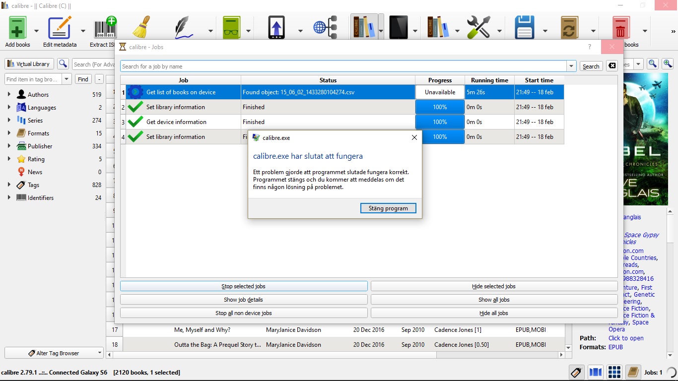It runs fine for a minute or so, then it stops and finally crashes (see pictures). It gets stuck pretty early on, on a .csv file. I tried removing it temporarily but then calibre gets stuck on something else before crashing. I can connect through calibre companion, but will only do so in an emergency, since the app doesn't allow me to sort the books in the order I want, it just puts them all in one, messy, folder. My reading app, Moon Reader Pro, allows me to sort the books according to the Storage Folder, which is important to me as I have about 1300+ books on my device. And I want to be able to use the wonderful feature in calibre by which I can update the metadata in my books, as long as there is a corresponding book in the calibre library. Can someone help, plz? I have rebooted the laptop and the phone, without success, tried running calibre as an administrator- nothing works. Can the initial run-through be skipped somehow?